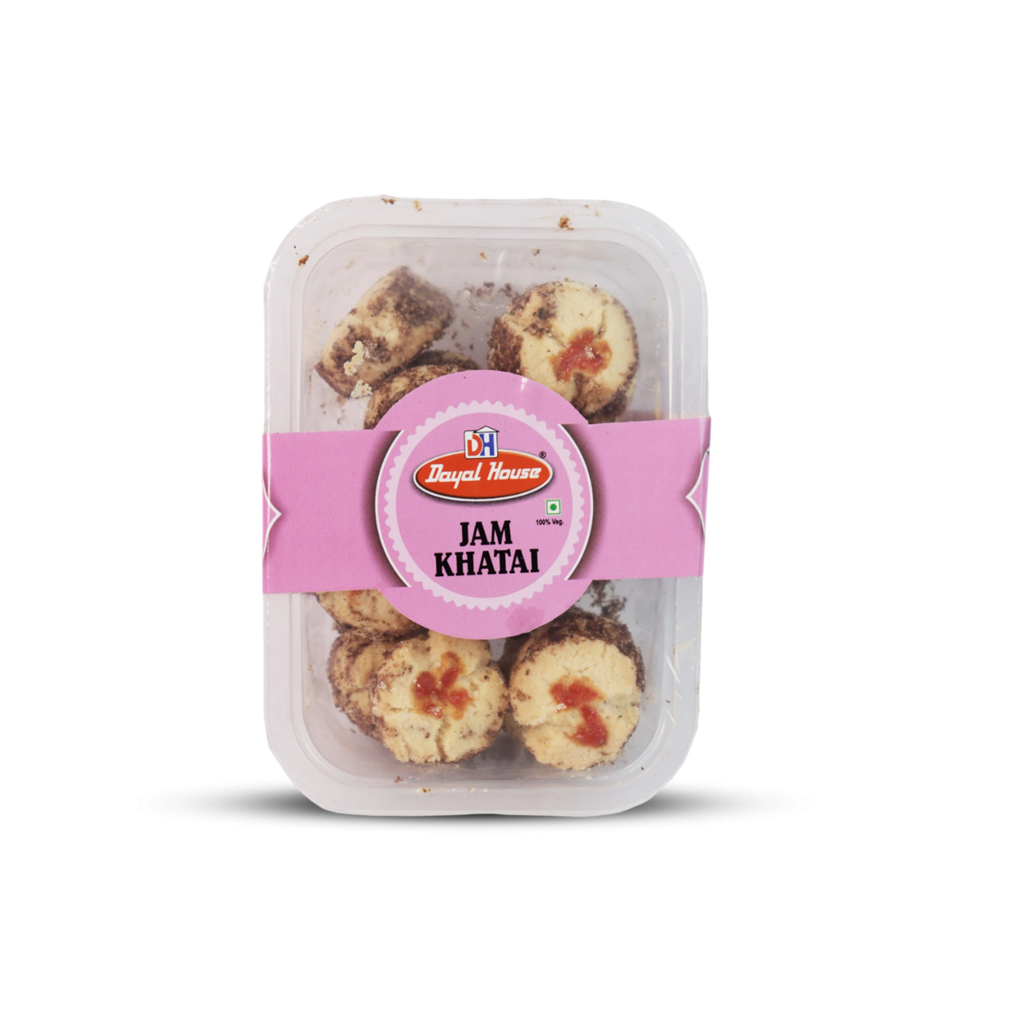 Jam Khatai is a delightful fusion of traditional Nankhatai (Indian shortbread biscuit) and fruity jam. Known for its melt-in-the-mouth texture and rich, buttery flavor, this biscuit is topped or filled with a dollop of sweet fruit jam—often strawberry, pineapple, or mixed fruit—adding a bright, tangy note to its soft, crumbly base.
