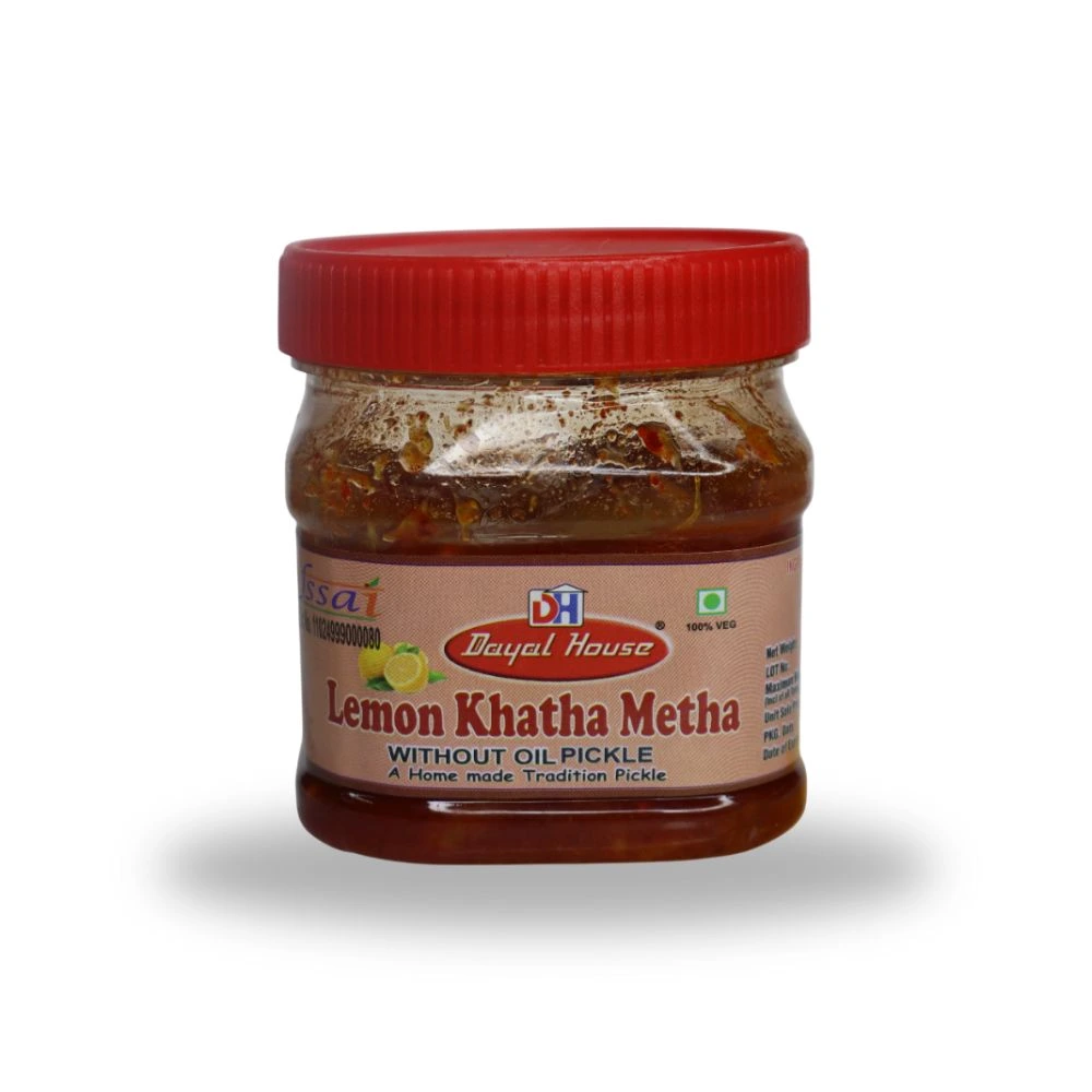 Dayal House Lemon Khatha Metha is a tangy and sweet pickle made with lemons, jaggery, sugar, and a blend of spices. It is known for its unique flavor profile and is a popular accompaniment to Indian meals.