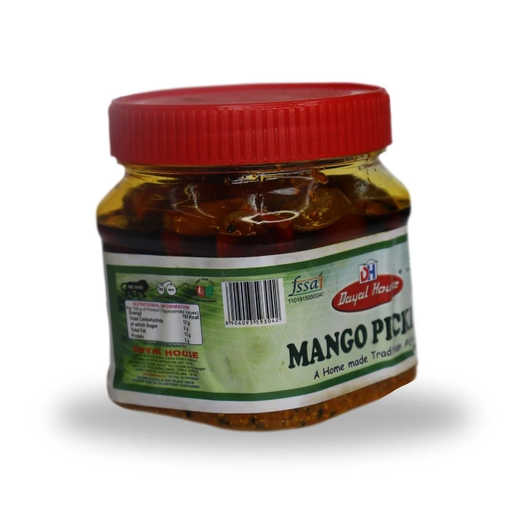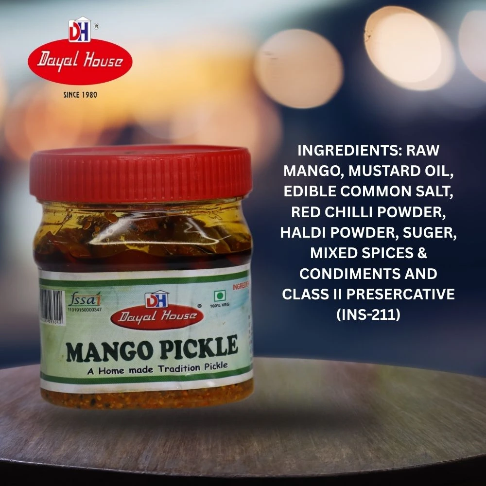 Dayal House Mango Pickle is a timeless culinary treasure, made from the finest, handpicked mangoes and a carefully curated mix of traditional spices. This pickle embodies the perfect balance of tanginess and spiciness, offering a burst of flavor that enhances any meal. Crafted with meticulous attention to detail and following age-old recipes, our mango pickle ensures a rich, authentic taste that brings a touch of nostalgia and tradition to your dining experience. Whether paired with rice, bread, or any Indian dish, Dayal House Mango Pickle is sure to elevate your meals, making every bite a delightful journey of flavors. Enjoy the taste of tradition with Dayal House Mango Pickle, a staple that promises to bring joy and flavor to your kitchen.